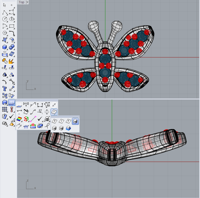 우선 큐빅을 숨겨놓고 나비 장식의 체적(=부피)을 구해보겠습니다. 명령을 적용하기 전에 각각의 부속을 따로 만들어 놓았다면 잊지 말고 합집합을 먼저 진행해 주셔야 합니다. 합집합을 해놓지 않으면 라이노는 겹쳐있는 부분까지 계산 해서 더해주기 때문에 실제보다 체적(=부피)이 더 크게 나올 수 있습니다.