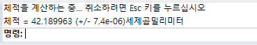 [계단식 배열 "분석"→계단식 배열 "질량 속성"→체적] 이 순서로 명령을 찾아서 적용하거나 명령어 입력에 Volume을 입력하셔도 좋습니다. 이렇게하면 대략 소수점 여섯 자리 수까지 나오는데 계산에 소수 여섯째자리까지는 필요하지 않습니다. 대략 소수 둘째 자리에서 반올림한 값을 개제의 체적(=부피)으로 계산하시면 됩니다.