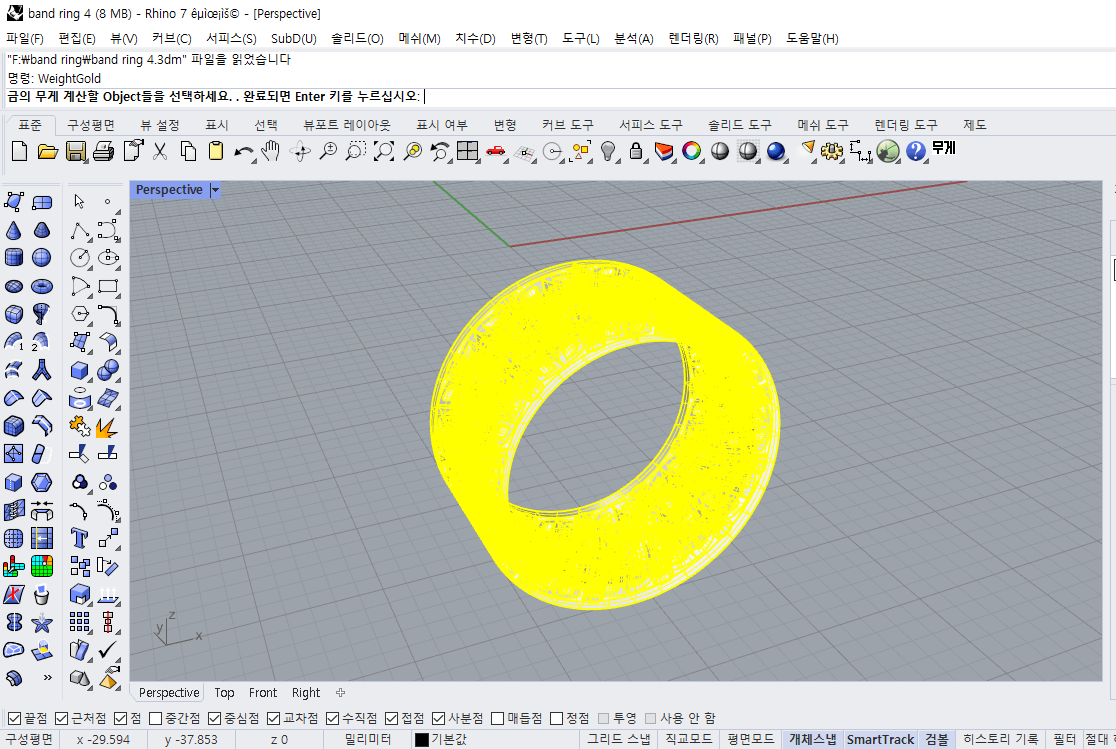 예시로는 제가 라이노 3D를 배우기 시작했을 때 핀터레스트에서 보고 따라 만들어봤던 반지를 가져왔습니다. 3D 출력을 생각하지 않고 만들었기 때문에 사방으로 무늬가 있어 뭔가 중량을 추정하기 어려워 보입니다. WeightGold는 첨부 파일로 올렸으니 확인해 보시길 바랍니다.
