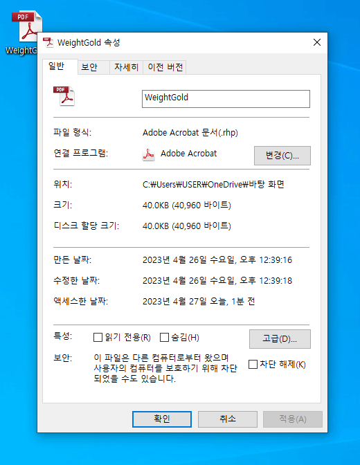 WeightGold를 먼저 설치해 보겠습니다. 먼저 윈도우에 플러그인을 설치가 차단되어있는 경우 그 차단을 해제해 주셔야 합니다. 차단을 해지하지 않으면 라이노에 플러그인을 설치할 수 없습니다. 첨부해 놓은 WeightGold를 내려받기한 후 아이콘이 생기면 우클릭합니다. 이때, 라이노 3D가 열려 있다면 먼저 프로그램을 닫고 작업을 계속해주세요.