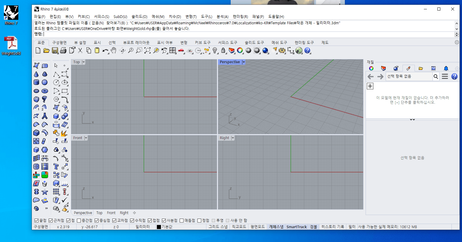 맨 아래에 있는 보안을 보시면 '차단 해제(K)'가 선택이 되어있지 않습니다. 이것을 체크해서 플러그인 차단 해제를 한 후, 적용을 누르고 확인을 클릭하고 창을 나가면 됩니다. 이제 라이노 3D에 들어가서 WeightGold를 설치해 봅시다. 라이노에 들어가서 상단 툴바에 플러그인 차단이 해제된 아이콘을 끌어다 놓습니다. 그럼, 명령 창에 플러그인이 로드되었다는 안내가 이런 식으로 뜨게 됩니다.